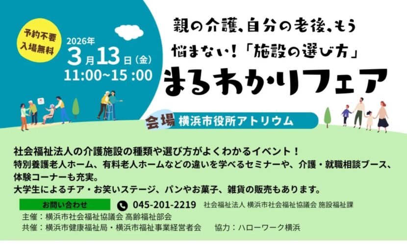 親の介護、自分の老後…もう悩まない!「施設の選び方」まるわかりフェア開催 横浜市内の社会福祉法人施設の案内が一堂に集まるイベントのお知らせです!「特養と有料老人ホームの違いは?」 「地域ケアプラザって何?」 そんな疑問を、施設の職員に直接聞けるチャンスです各施設の施設長によるセミナーや、専門職による介護相談ブースなど、役立つ情報が満載。ハローワークによる就職相談ブースもありますので、お仕事に興味がある方も大歓迎です。日時:2026年3月13日(金)11:00~15:00 会場:横浜市役所アトリウム 参加費:無料 当日はパン・お菓子・雑貨の販売や、学生さんによるチア・お笑いライブなどのステージイベントも開催!ぜひお気軽にお立ち寄りください ▼詳細はこちらをCheck! (URL)https://www.yokohamashakyo.jp/corp/bukai/#横浜市 #介護 #老人ホーム #福祉イベント #施設の選び方まるわかりフェア#社会福祉 #特養 #特別養護老人ホーム #ケアプラザ #地域ケアプラザ #CP #無料イベント #就活 #親の介護 #終活 #老後 #施設探し#横浜市役所 #手作りパン